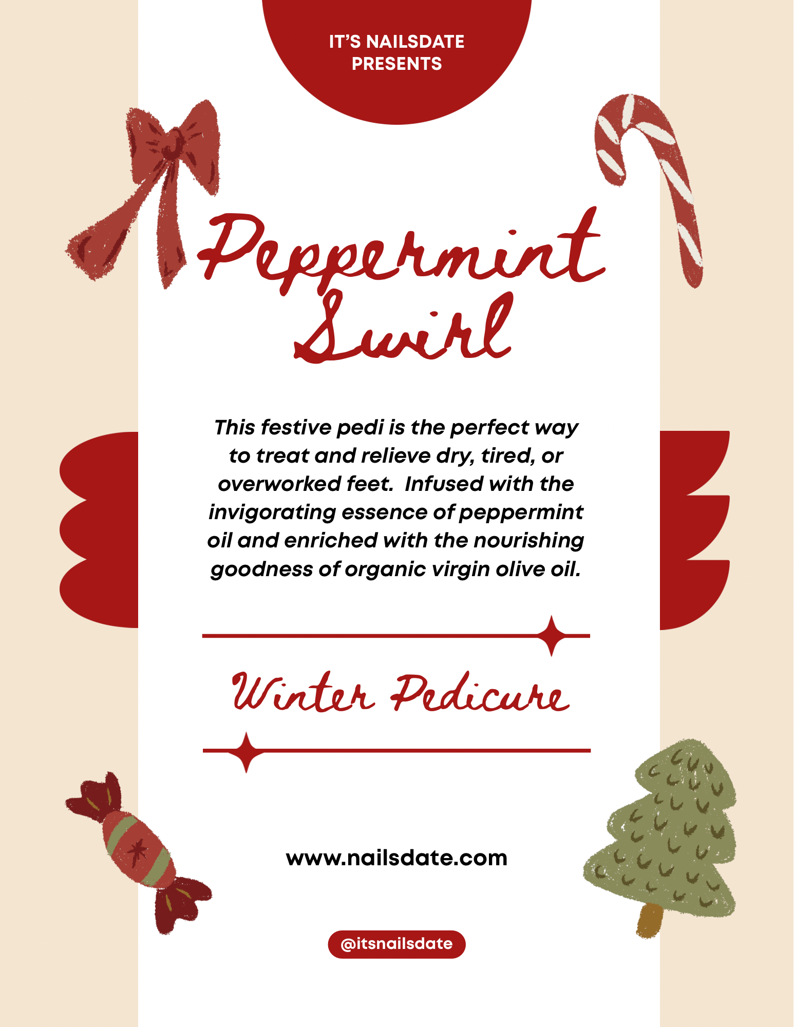 Includes soak, shape, callus care, sugar scrub, mask, warm stones & towel, massage and polish — all paired with rotating seasonal scents and small touches.